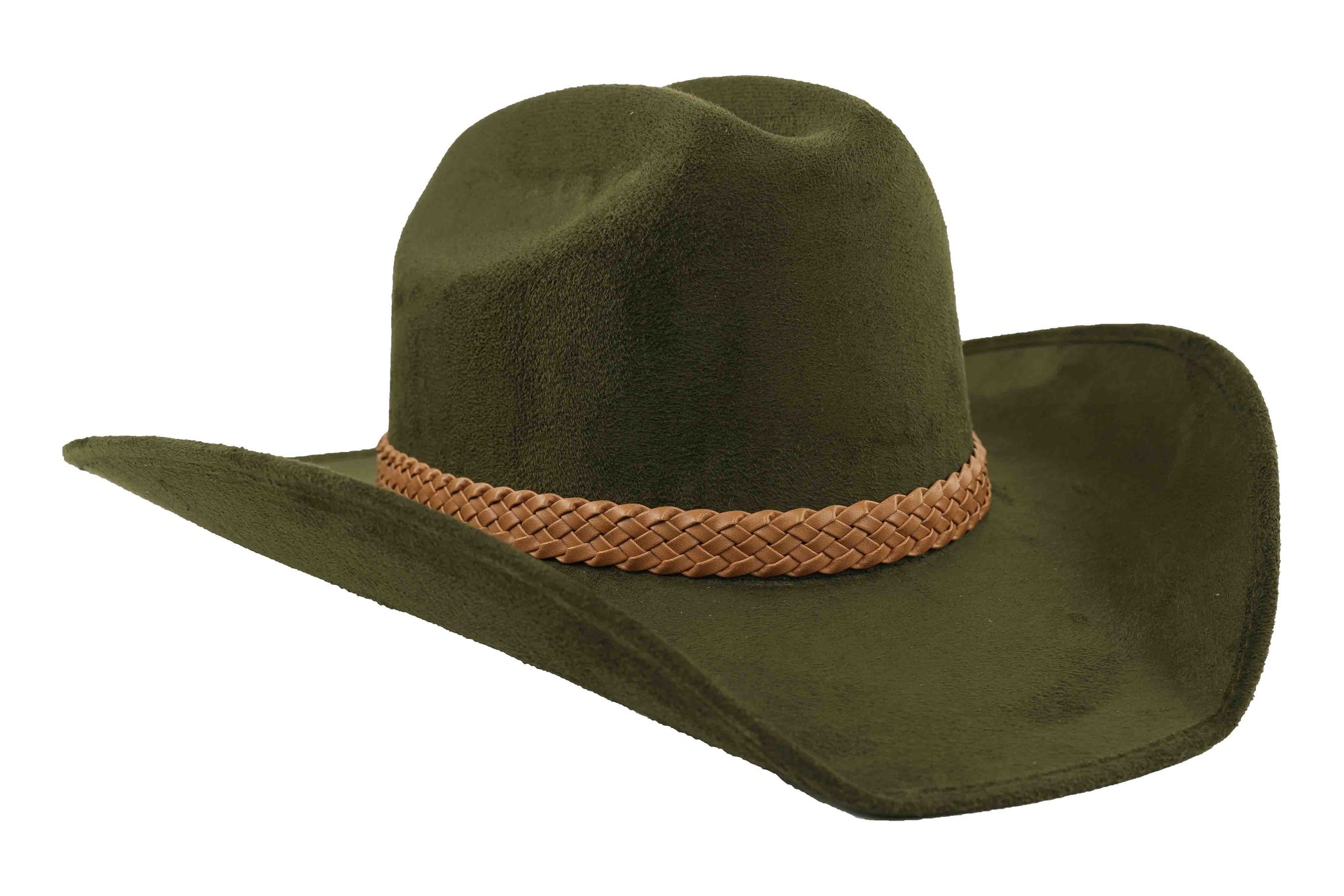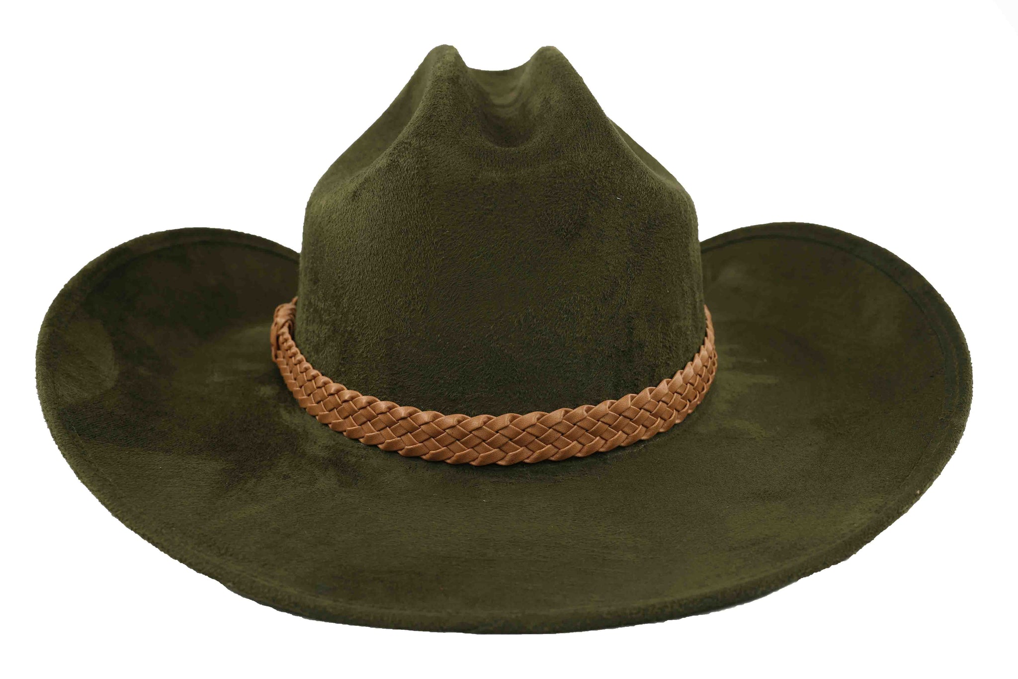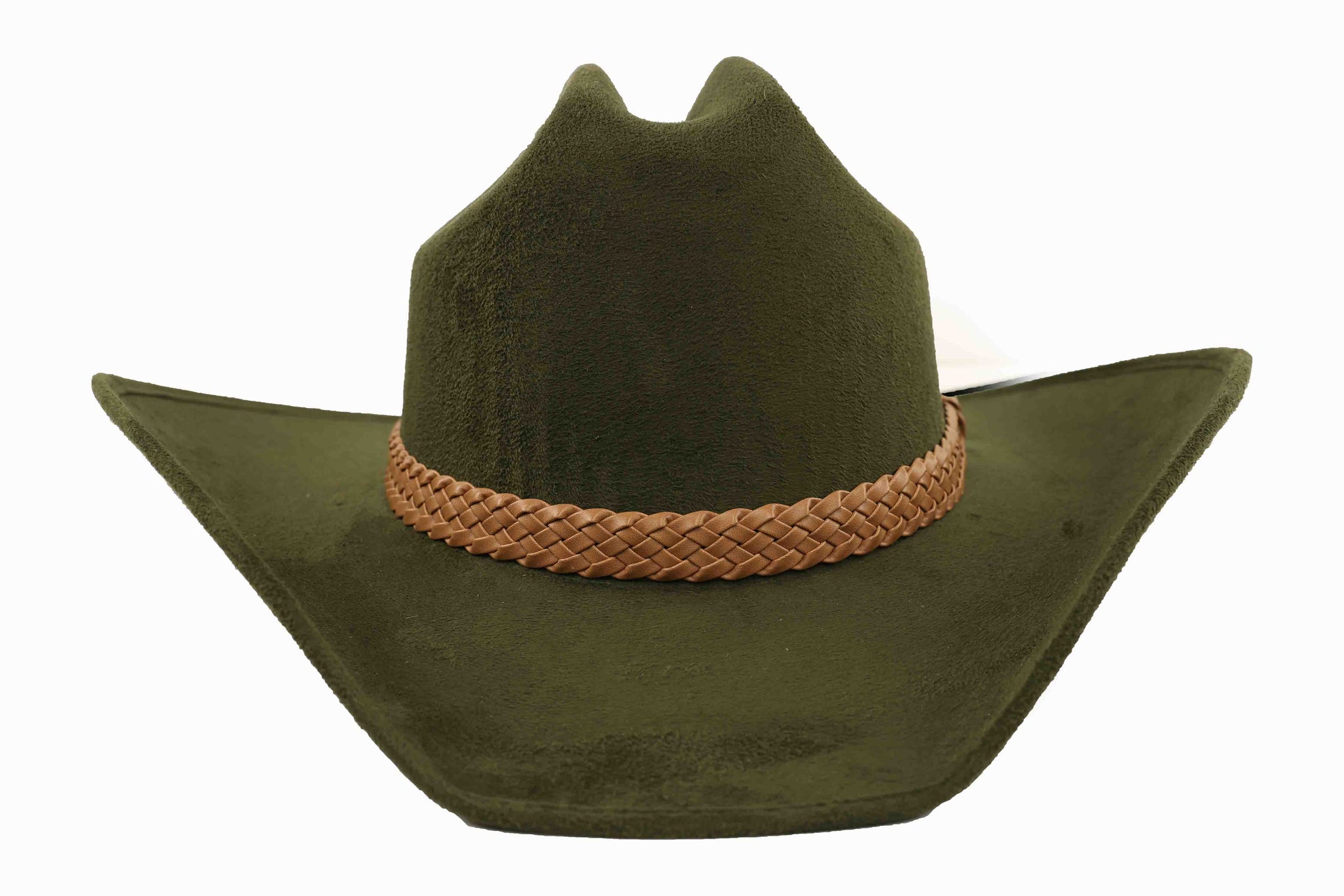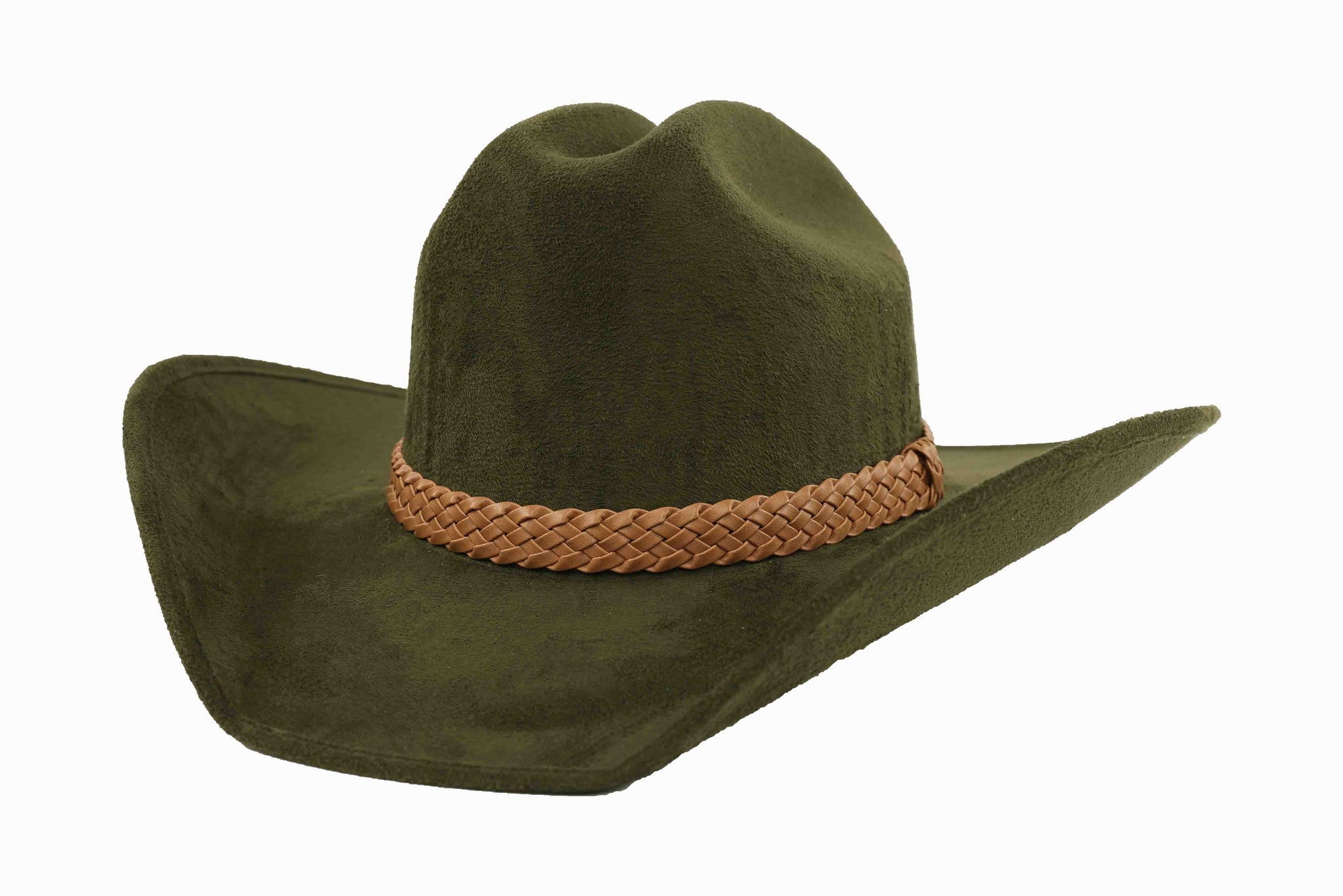 The Apple suede western hat blends classic craftsmanship with contemporary allure. The structured crown and sleek brim are elevated by a polished tan braid that wraps the base, creating a perfect balance of western heritage and high-fashion artistry.