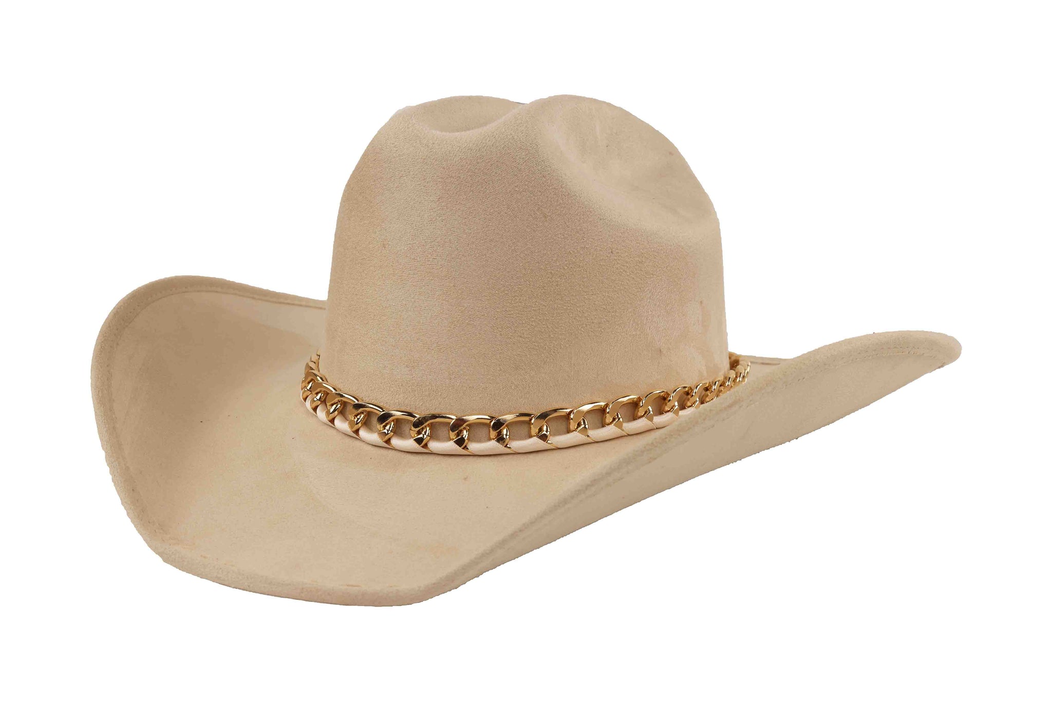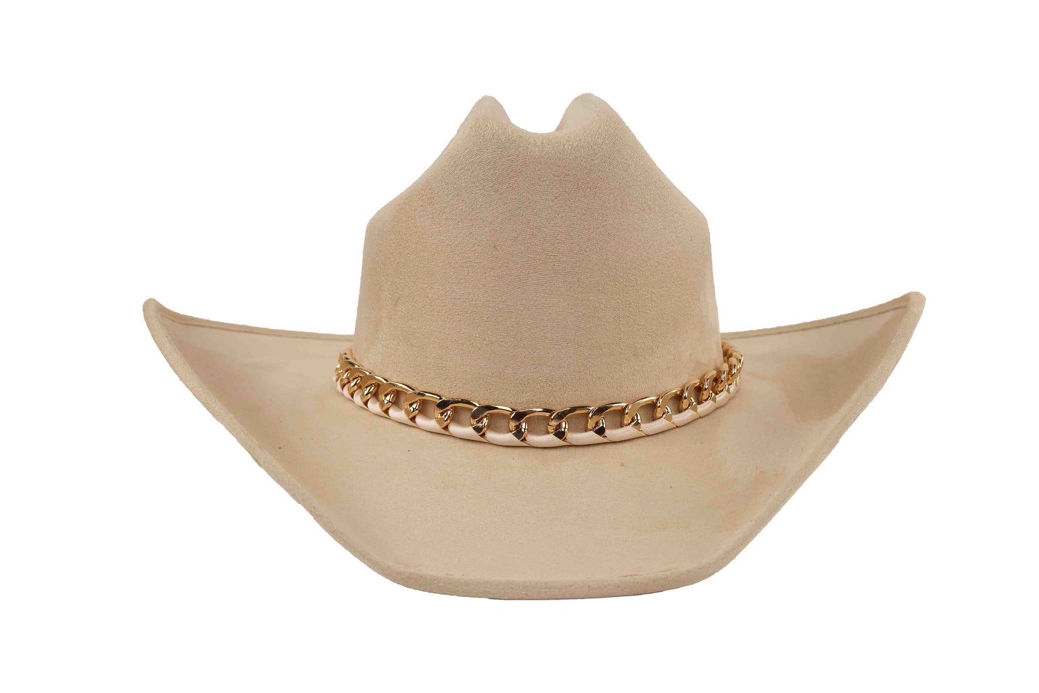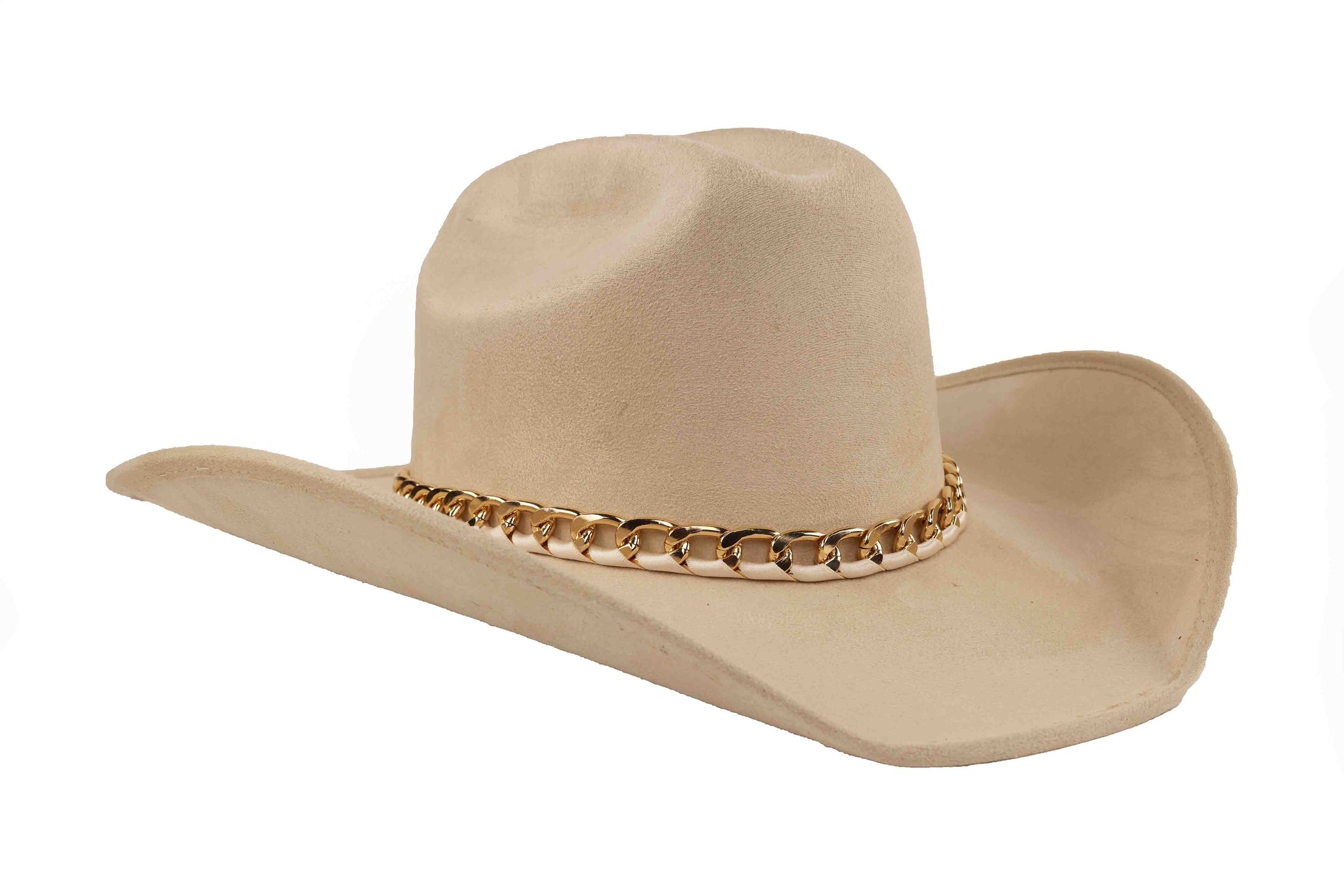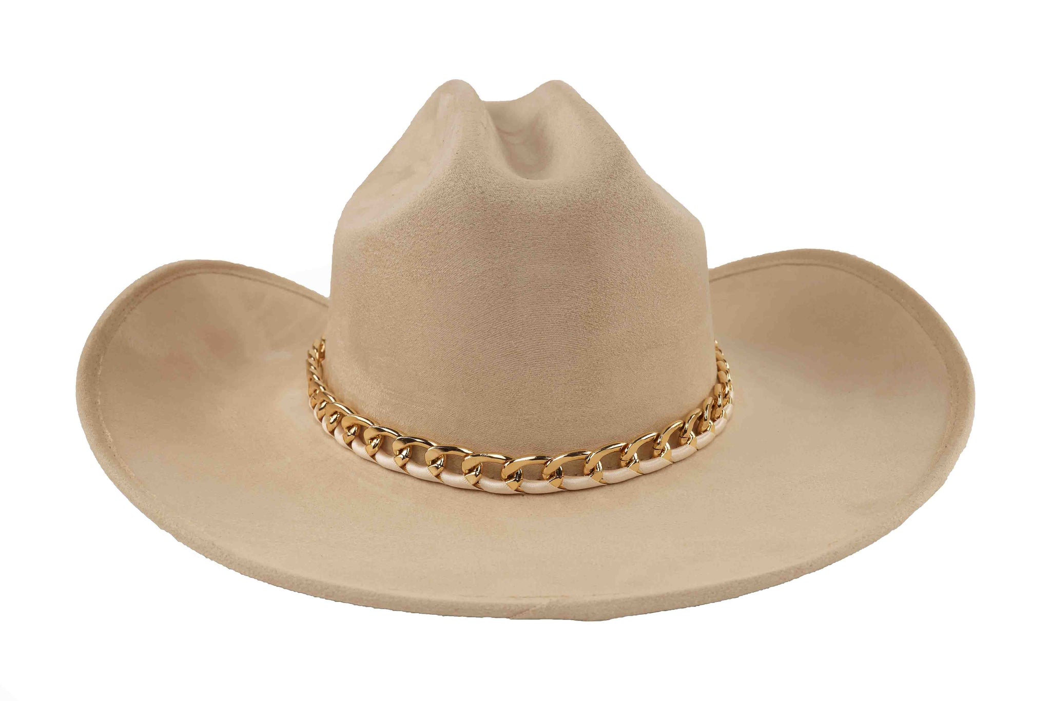Inspired by the surreal beauty of Vincent's world, this wool western hat blends classic craftsmanship with contemporary allure. The structured crown and sleek brim are elevated by a polished gold chain that wraps the base, creating a perfect balance of western heritage and high-fashion artistry.