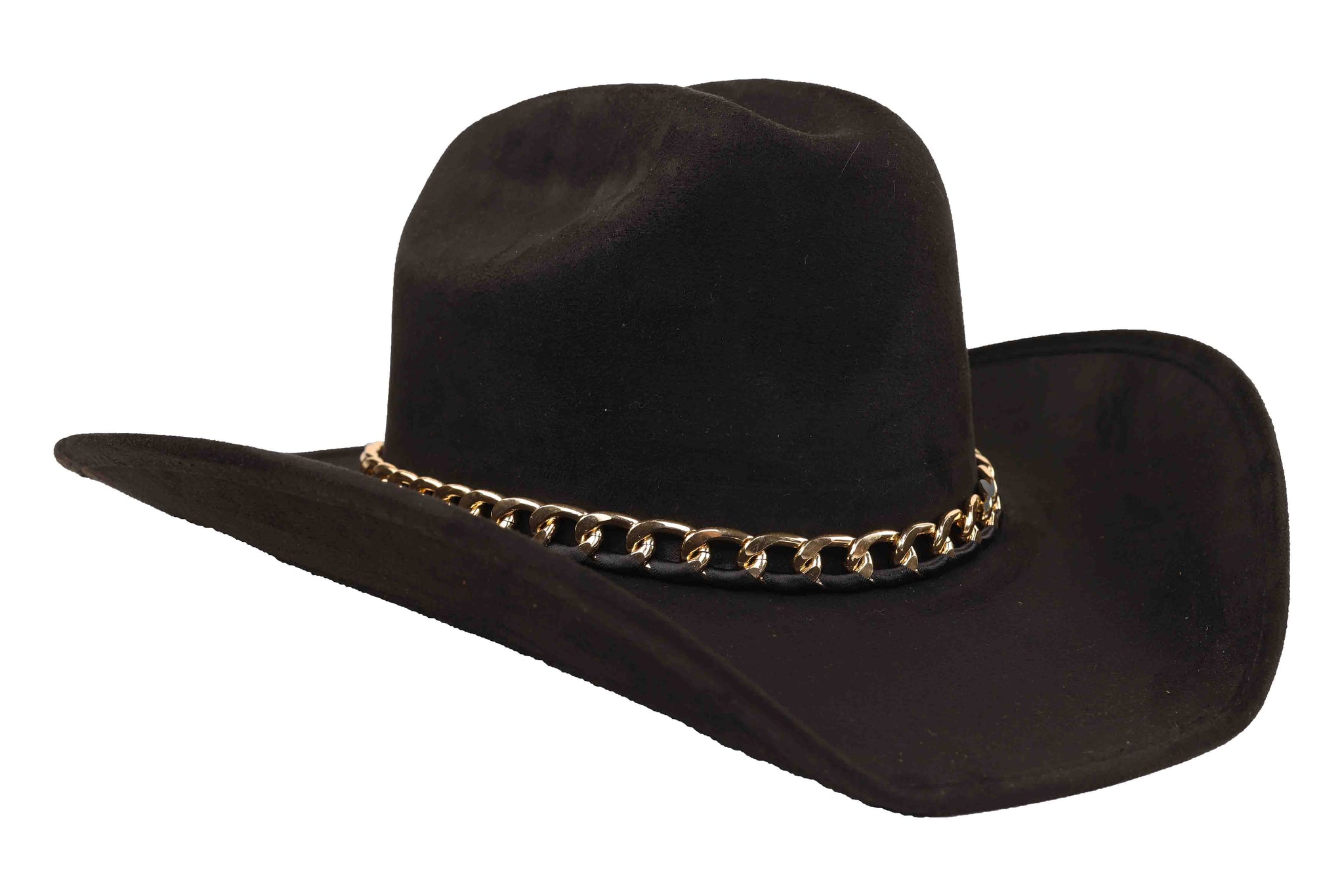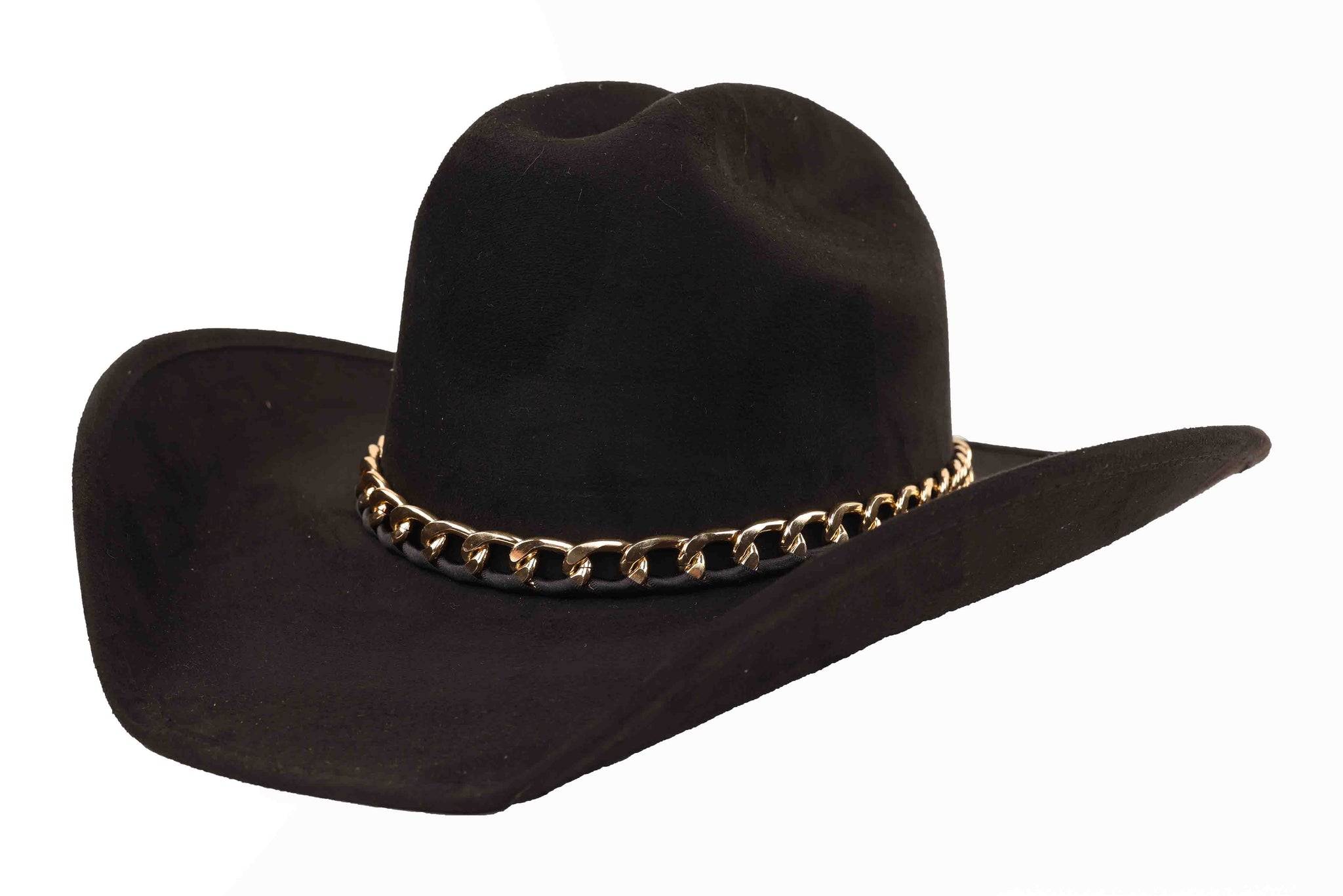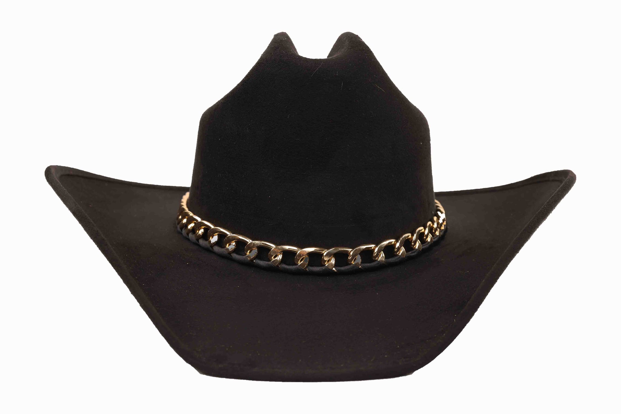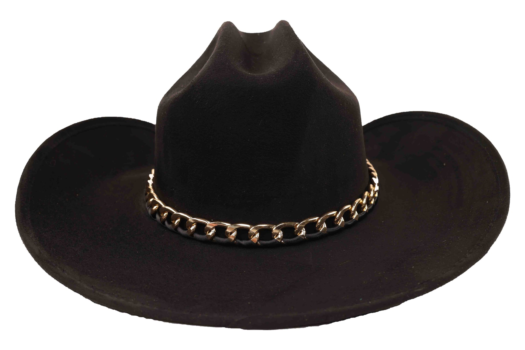 Inspired by the surreal beauty of Vincent's world, this wool western hat blends classic craftsmanship with contemporary allure. The structured crown and sleek brim are elevated by a polished gold chain that wraps the base, creating a perfect balance of western heritage and high-fashion artistry.